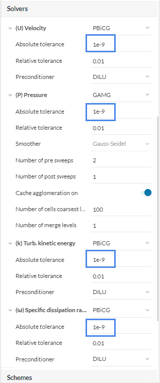 In cases where a high-quality mesh has been achieved, further result improvements can be achieved by reducing the coefficient of the pressure gradient scheme to 0.5 or switching to the Gauss linear gradient scheme.
