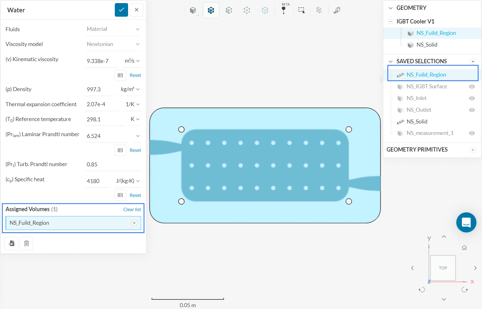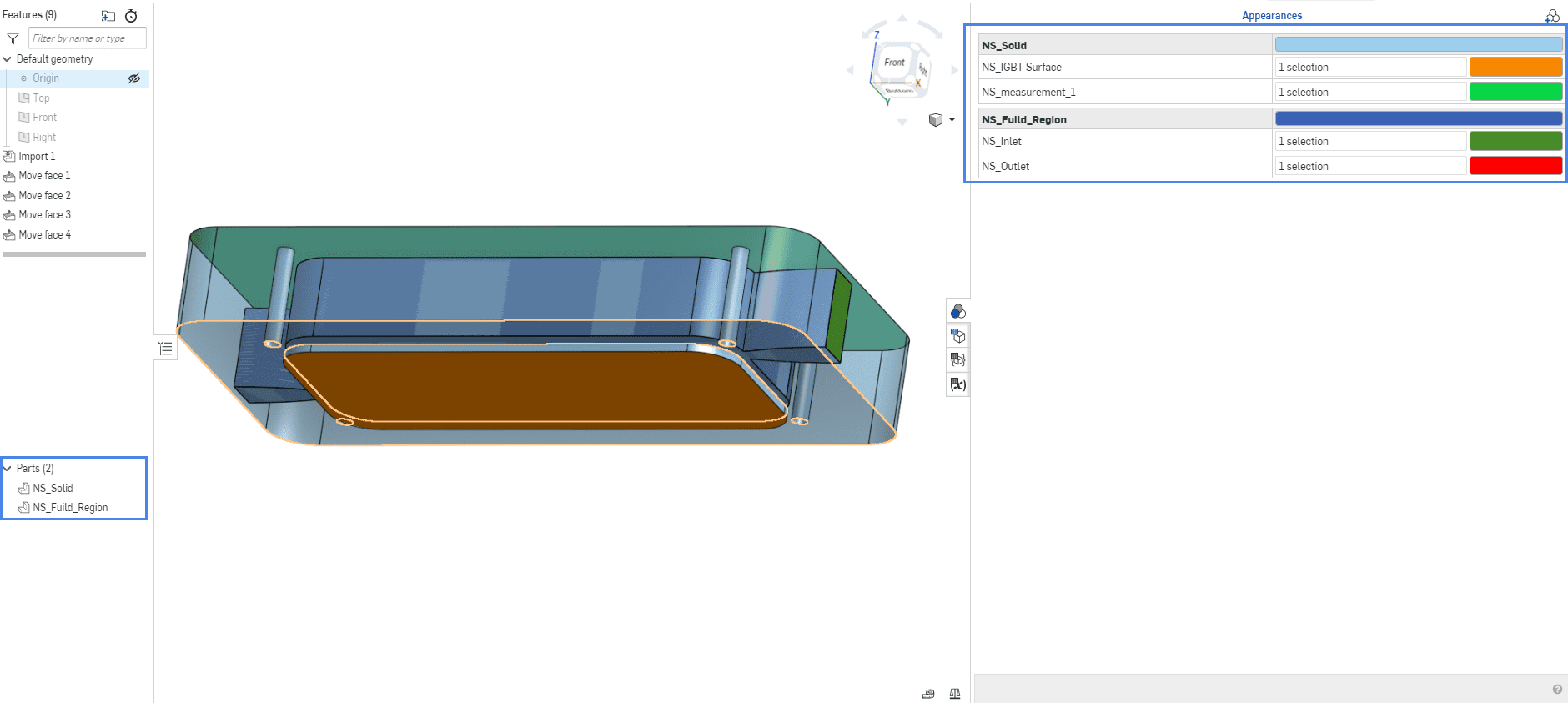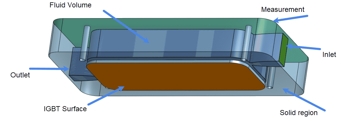 For the IGBT Cooler, a conjugate heat transfer analysis is necessary to simulate the heat transfer from the solid material to the fluid. This example focuses on the setup which is specific to the NS_ Tags. A more detailed tutorial on how to set up a Conjugate Heat Transfer Analysis can be found here: