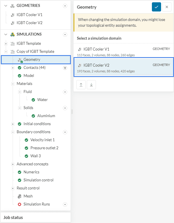 After duplicating the simulation template the geometry can be replaced. SimScale now detects the saved selections and replaces them accordingly. Without making any further changes to the simulation setup the new geometry can now be simulated.