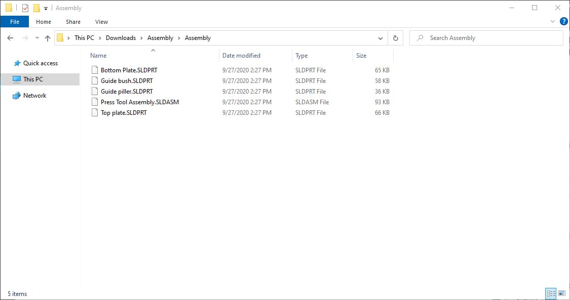 Firstly, to successfully upload the pressure tool, create a folder that has the assembly file (*.sldasm or *.iam) and the parts that make up that assembly. For example, the figure below shows the assembly file of the pressure tool and the parts that make up the pressure tool.