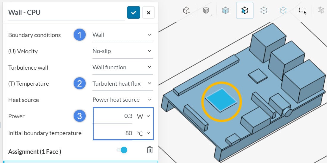 Define the initial temperature of the fluid domain. To clarify, the Temperature section is a quick way to assign temperature values on the whole fluid region. Moreover, you can create a subdomain to define the initial temperatures in specific regions.