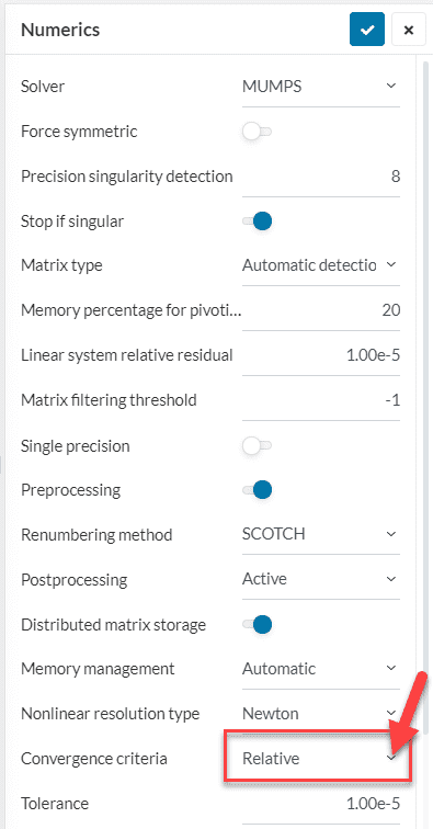 Switching between absolute and relative residual definition is achieved under the ‘Numerics’ dialog as shown below,