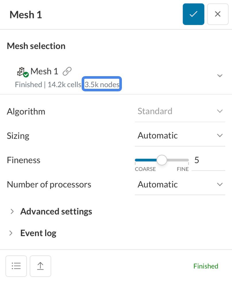 Second order elements are a type of finite element that capture the structural behavior more accurately but are computationally intensive due to the increased number of nodes. Users should note that when discussing meshes in FEA the number of nodes is the defining feature, not the number of cells. You can check the number of nodes in any of your generated meshes as shown below: