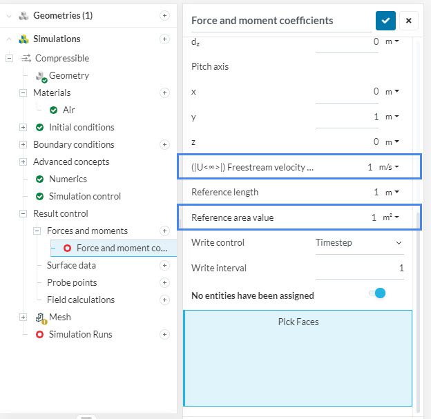 The user defines these parameters under “Forces and moments coefficients”. By default, they receive a value of 1.