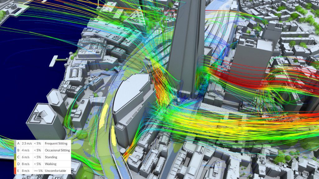 Published in August 2019, the Wind Microclimate Guidelines for Developments in the City of London describe the required studies to assess a planned structure’s impact on the comfort and safety of nearby pedestrians and cyclists. Within the guidelines, computational fluid dynamics (CFD) is among the recommended approaches for buildings 25 meters or higher and is a requirement for buildings 50 meters or higher. Further, the guidelines encourage developers to address wind impact early in the design process and require that multiple scenarios are studied.
