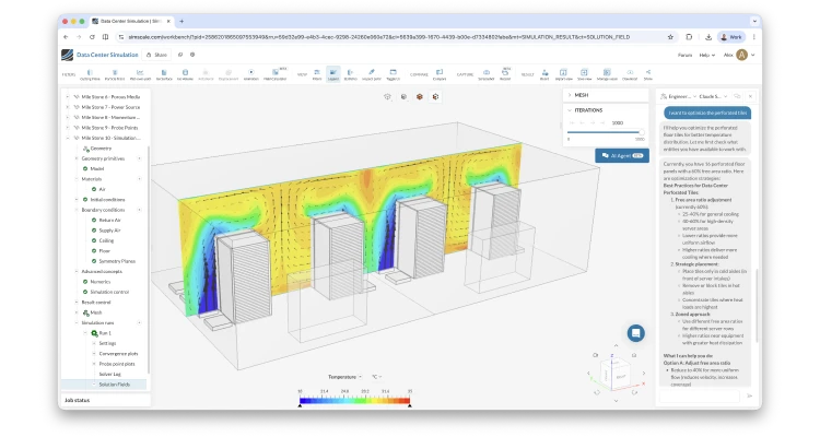 Validate cooling efficiency and prevent thermal failures with cloud-native CFD simulation and Engineering AI. Model complex airflow, temperature distribution, and high-density equipment loads to ensure SLA compliance. Whether you are retrofitting for AI workloads or designing greenfield sites, solve for space, power and cooling in the cloud.